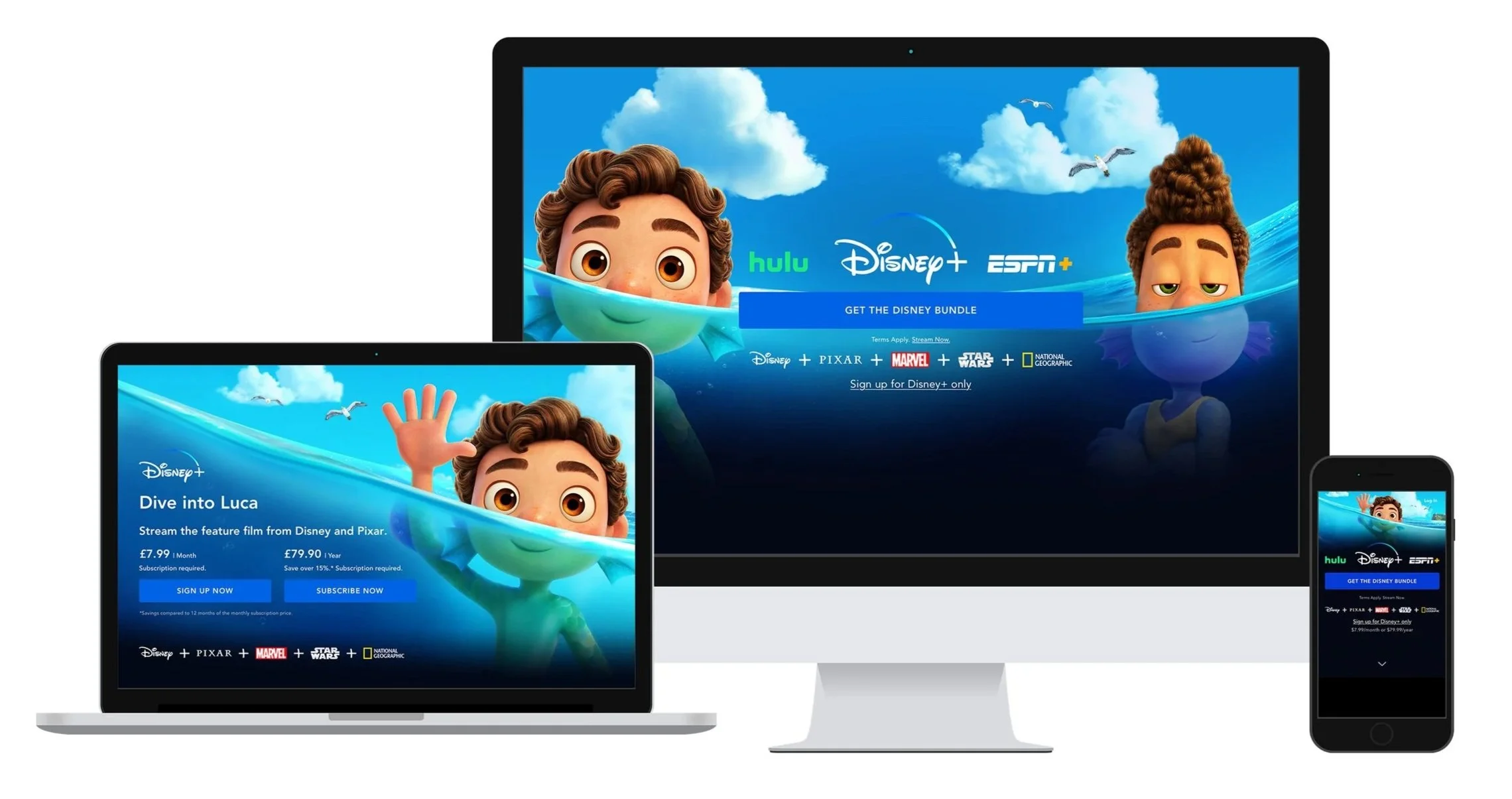 Desktop, Tablet, and Mobile landing pages were needed when Disney and Pixar’s Luca arrived onto the service. We needed to create image assets that would fit with the CTA and messaging for both US and EMEA regions.