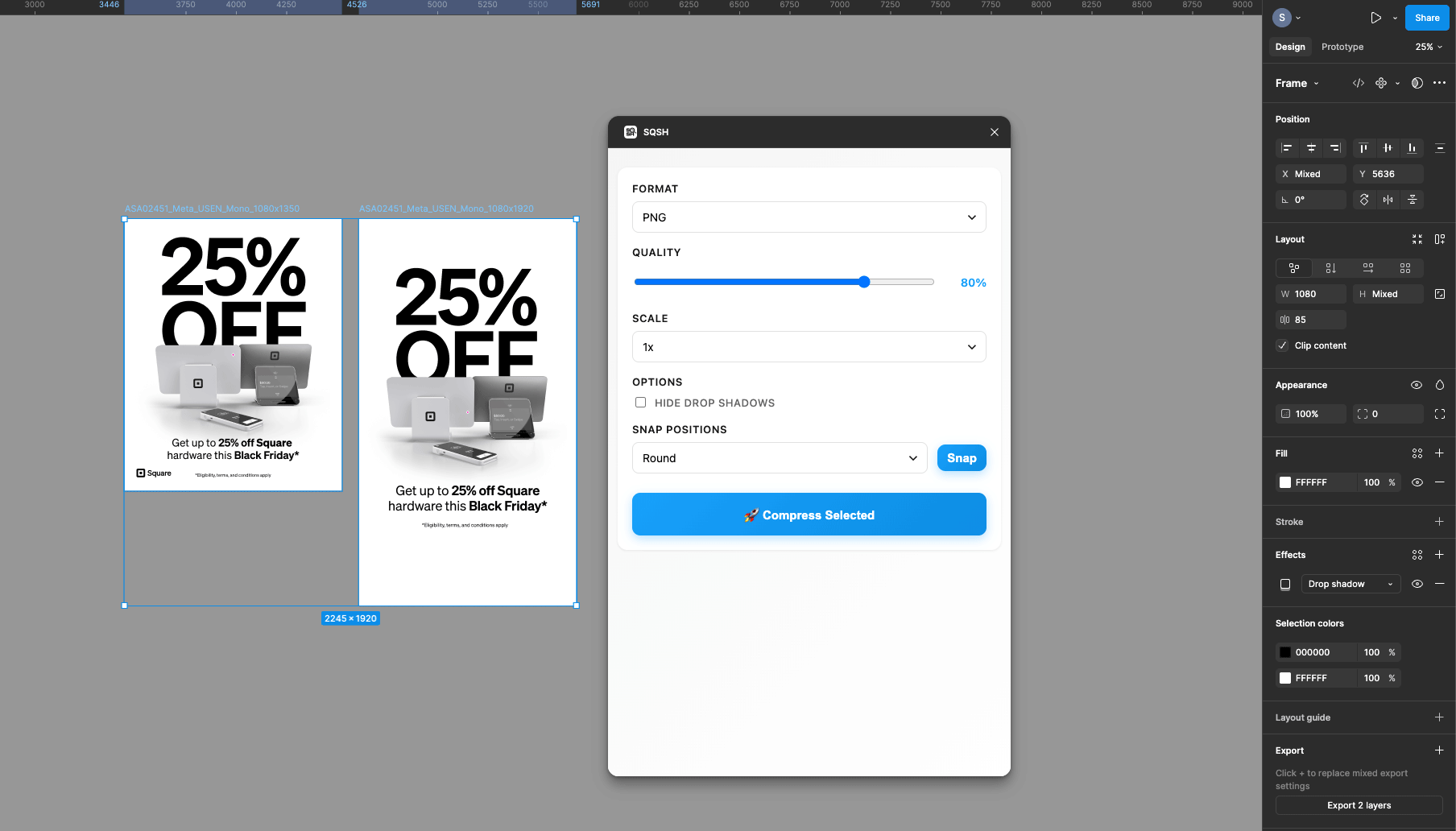SQSH is a Figma plugin I built to take the friction out of exporting assets. It automatically compresses PNGs and JPGs—letting you skip external tools like TinyPNG—while keeping everything crisp. It also snaps layers to whole-pixel values so final exports don’t end up with those extra, unintended pixels Figma adds when rounding decimals. And for anyone who’s ever accidentally exported a frame with a drop shadow, SQSH can temporarily hide them to prevent shadows from inflating the final dimension